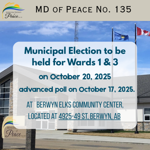 Any questions regarding the 2025 MD of Peace No. 135 Municipal Election, they should contact the Returning Officer, Dianna Butz by phone 780-338-3845 or email dbutz@mdpeace.com