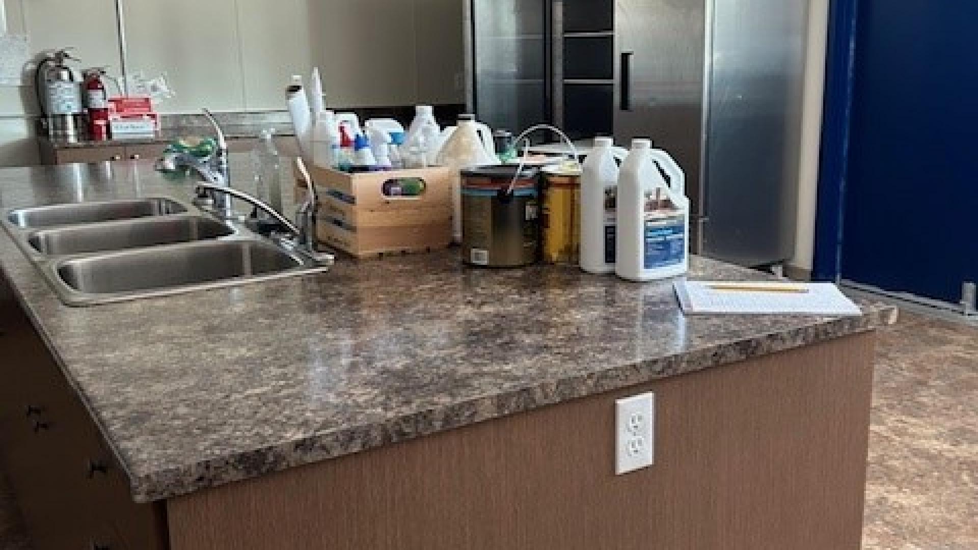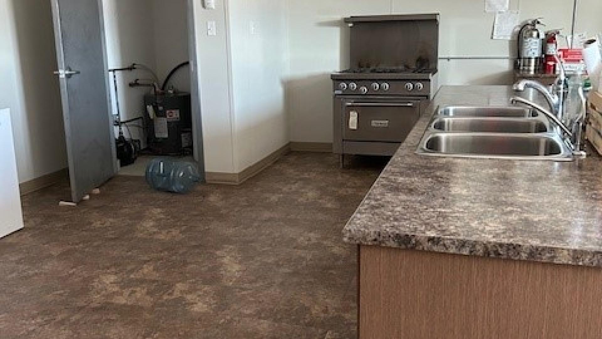 A NEW 24′ x 26′ kitchen was added to the north end of the hall in 2015. It is equipped with an upright cooler, 6 burner commercial gas range with oven, 3 sinks, and a small chest freezer. Although there are no dishes or small appliances, there is plenty of counter space for caterers to work on for food preparation, as well as cupboards. The kitchen can be rented independently if needed.