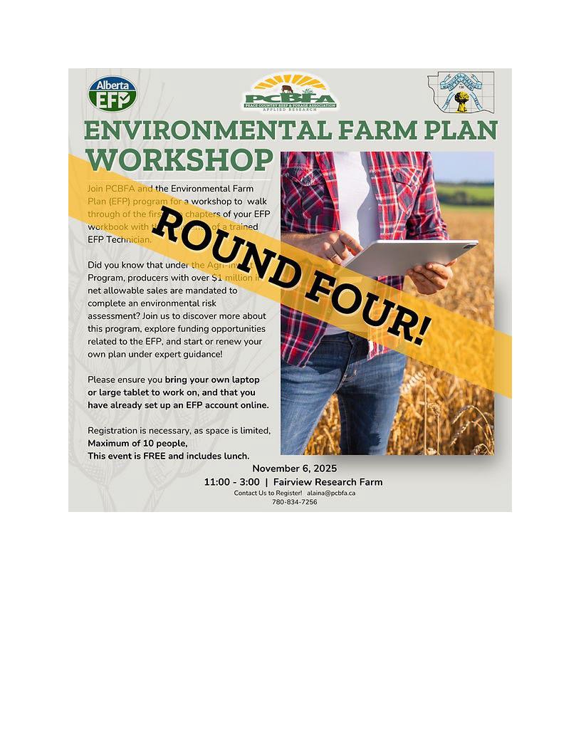 Join PCBFA and Alberta EFP for our Environmental Farm Plan Workshop on Thursday, November 6 at Fairview Research Farm. This interactive workshop will guide you through the early chapters of your EFP workbook with the support of a trained technician.