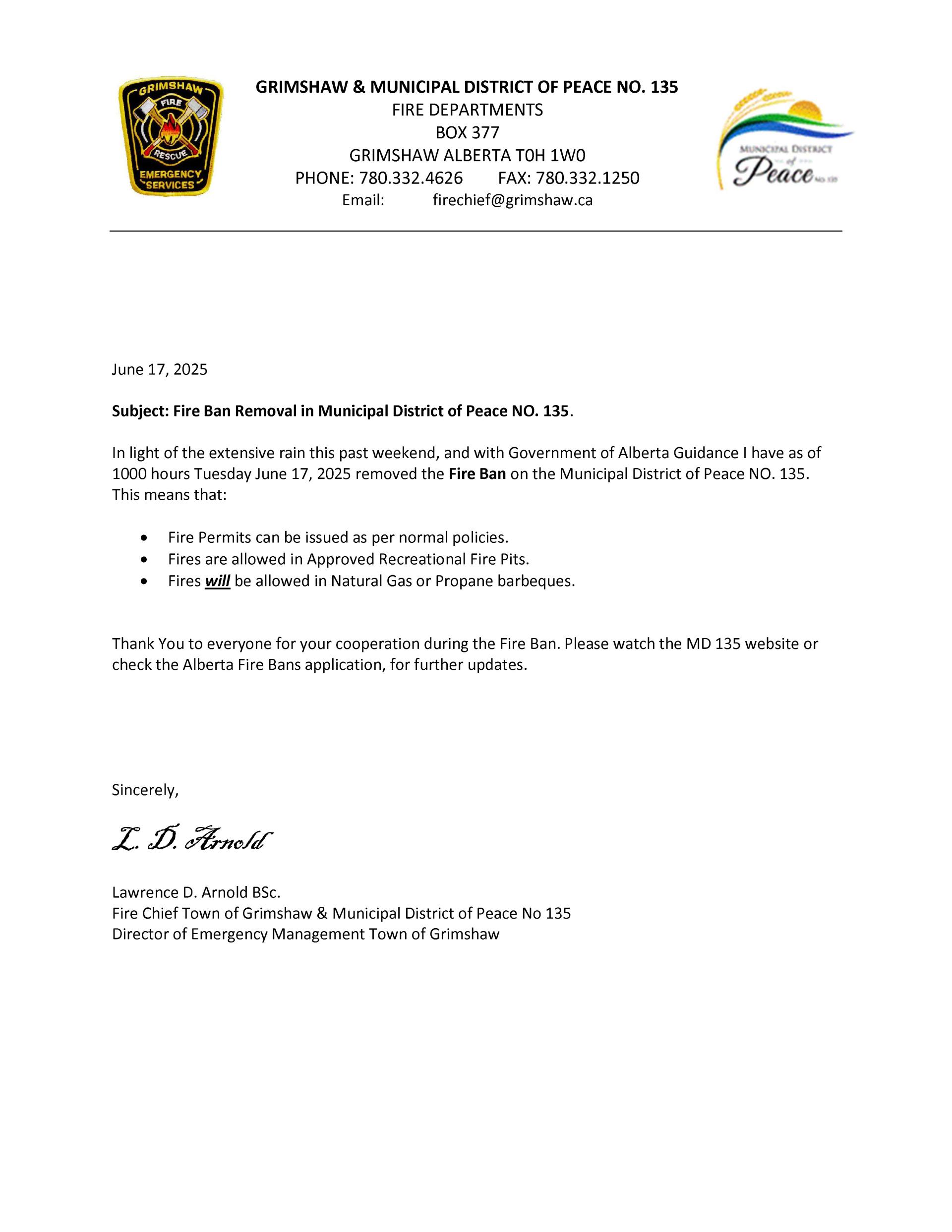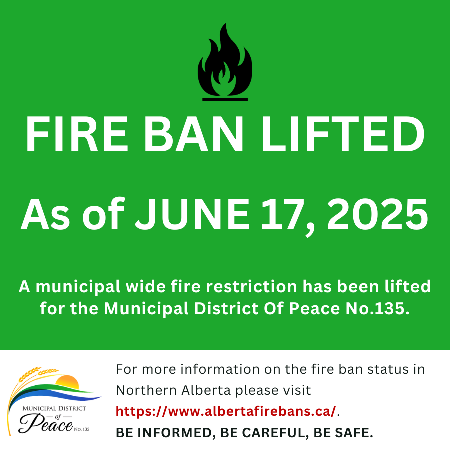 In light of the extensive rain this past weekend, and with Government of Alberta Guidance the Fire Ban in the Municipal District of Peace No. 135 was lifted as of 10:00 am, Tuesday, June 17, 2025.