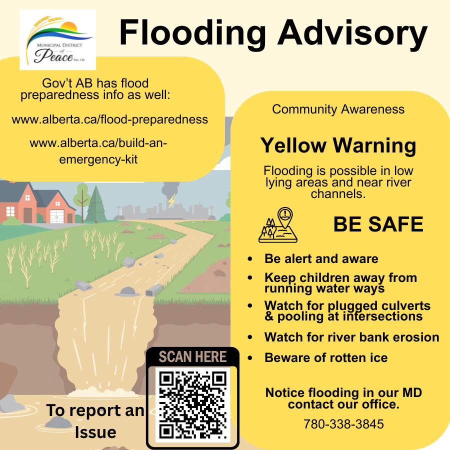 The Public Works crew will address areas of concern as quickly as possible, but response times may vary as higher-priority issues arise. Despite the MD's proactive approach and the assistance of contractors and residents, pooling and fast-flowing water in drainage courses should be expected. Urgent issues such as wash-outs, localized flooding, or significant road damage should be reported immediately to the MD by calling 780 338 3845.