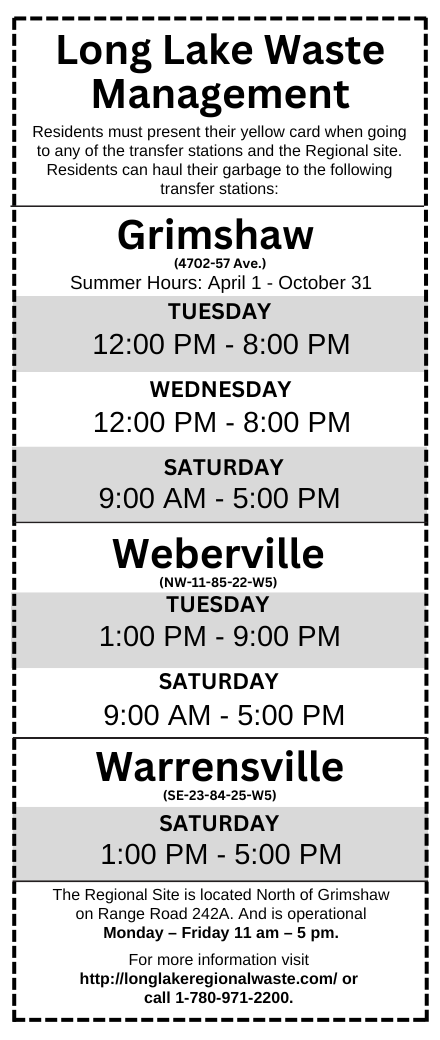 To obtain a Long Lake Regional Waste card, visit the MD of Peace office (one per household).