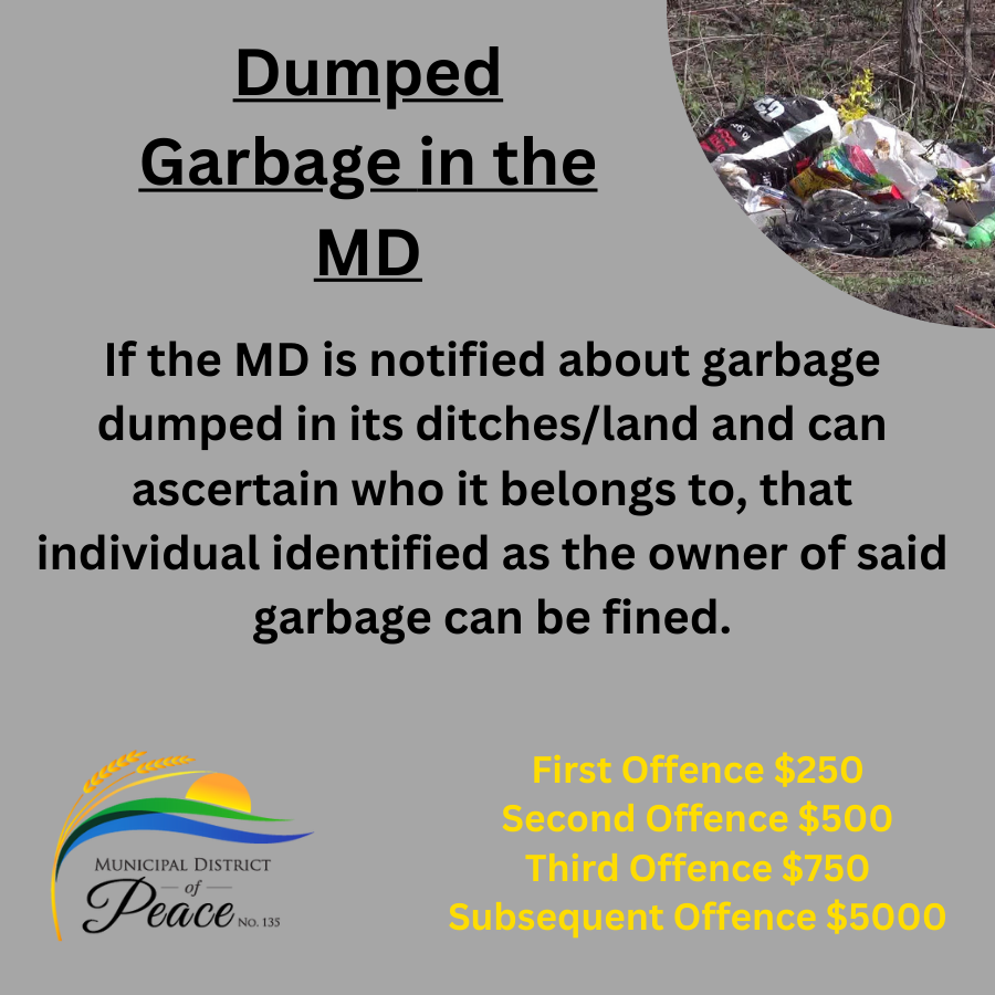 If the MD is notified about garbage dumped in its ditches or on its land and can ascertain who it belongs to, that individual identified as the owner of said garbage will be fined.