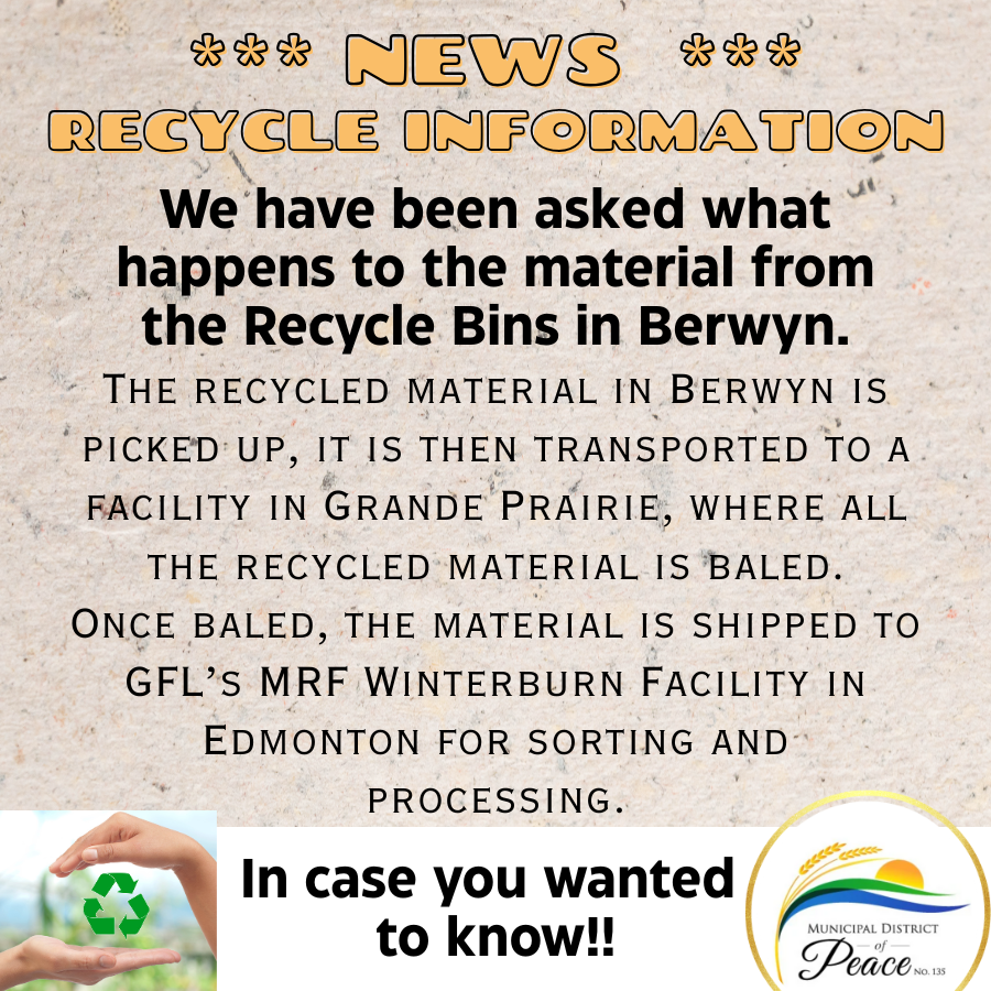 "The recycled material in Berwyn is picked up, it is then transported to a facility in Grande Prairie, where all the recycled material is baled. Once baled, the material is shipped to GFL’s MRF Winterburn Facility in Edmonton for sorting and processing."