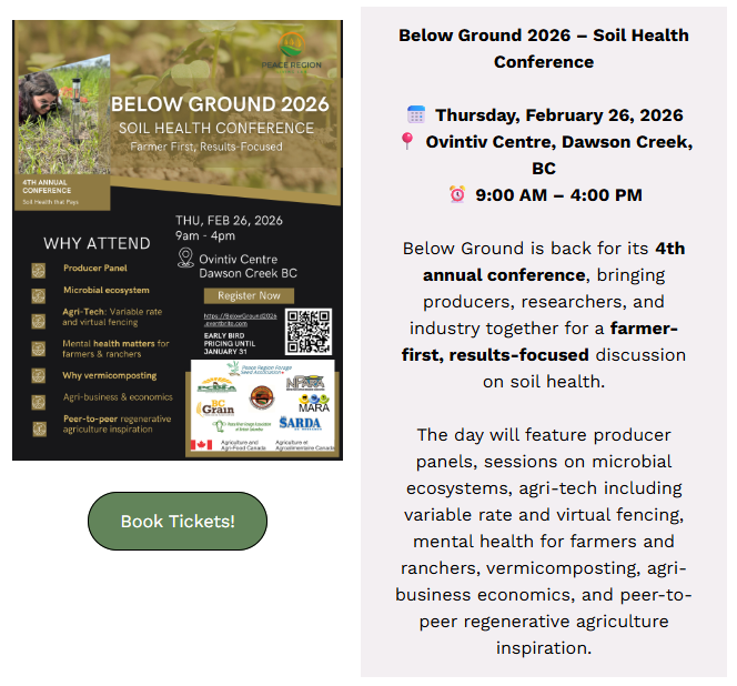 • Below Ground 2026 - Soil Health Conference - February 26, 2026, in Dawson Creek, BC at the Ovintiv Centre 9:00 am - 4:00 pm
