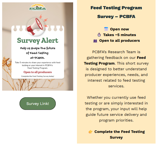 • Feed Testing Program Survey - PCBFA site, the survey has been uploaded to the survey tab on the home screen of our MD of Peace No. 135 website; MD of Peace - Survey Page