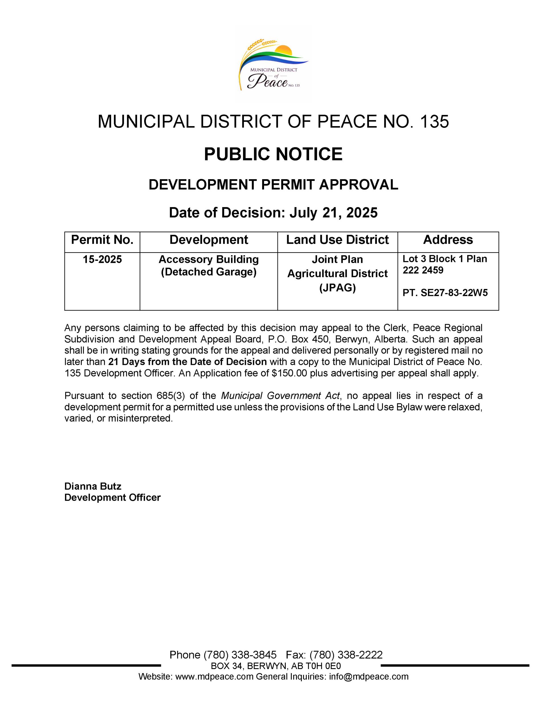 Public Notice - DEVELOPMENT PERMIT APPROVAL (Permit # 15-2025)