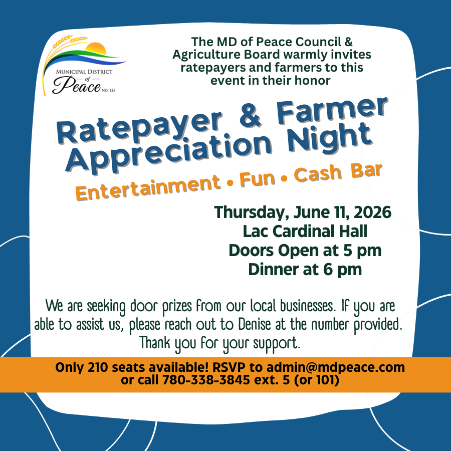 We are seeking door prized from our local businesses. If you are able to assist us, please reach out to Denise at the MD office at 780-338-3845 option #5. Thank you for your support.