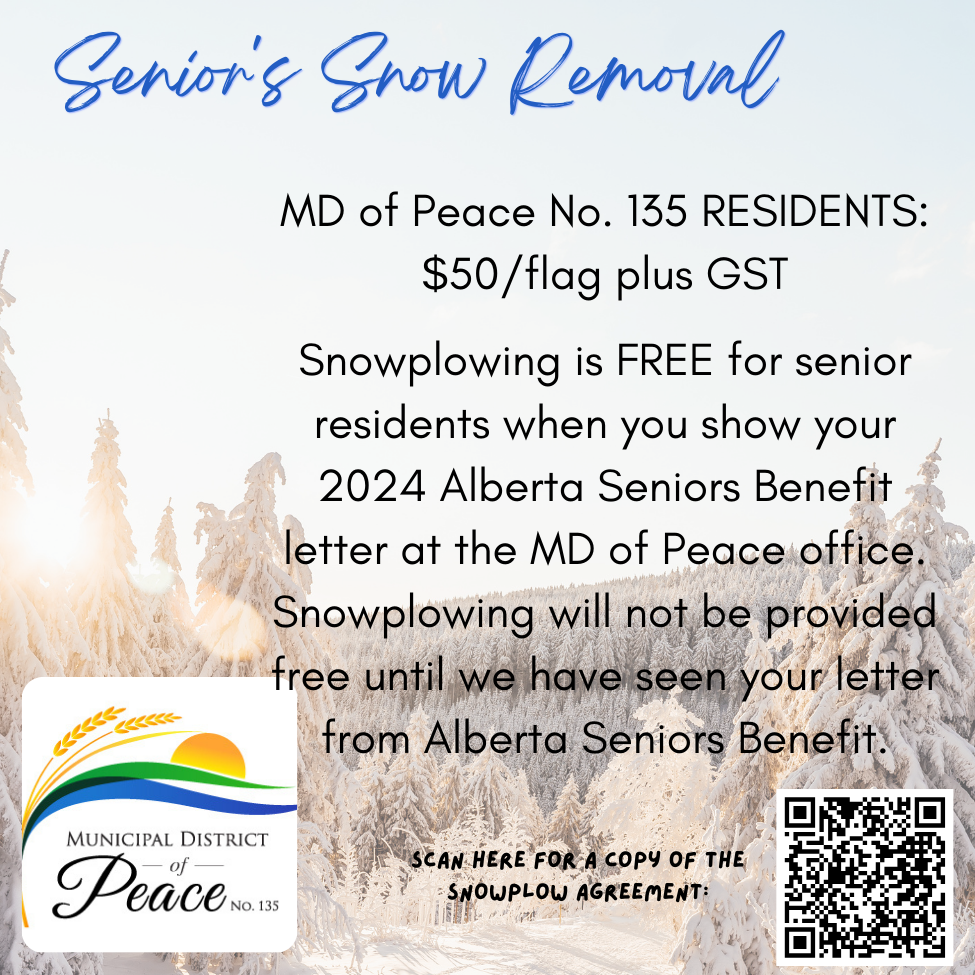 Snowplowing is FREE for senior residents when you show your 2024 Alberta Seniors Benefit letter at the MD of Peace office. Snowplowing will not be provided free until we have seen your letter from Alberta Seniors Benefit.