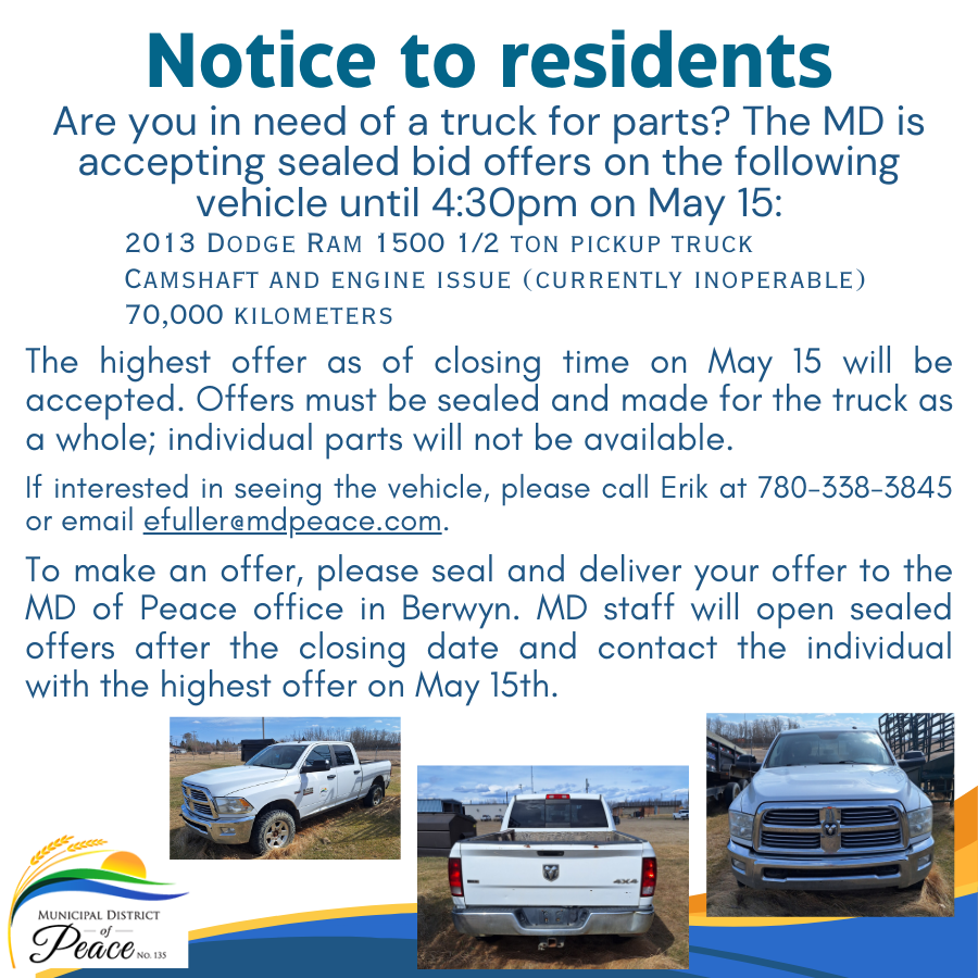 To make an offer, please seal and deliver your offer to the MD of Peace office in Berwyn. MD staff will open sealed offers after the closing date and contact the individual with the highest offer on May 15th.